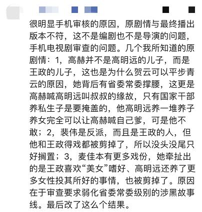 高明远还养了更多的女性投其所好的事情,也都被剪掉了。说完之后该网友还补充了一句,这么多“原剧情”被剪掉的原因,其实就在于审查要求弱化省常委级别的涉黑故事线,原来的剧情审核不过,经过修改之后才有了我们看到的这个版本。