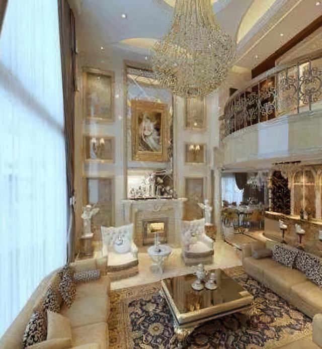 进入室内之后可以看到设计非常奢华,客厅也是以欧式古典风为主,浅色系的欧式皮质沙发和深色的地毯,有种撞色的效果,时尚大方。