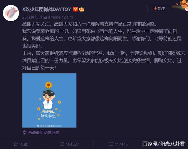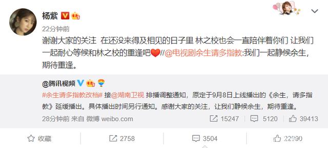 之后,《余生,请多指教》官微,主演肖战、杨紫也各自通过微博发布了相关消息,肖战表示:“感谢大家关注,感谢大家和我一样理解与支持作品正常的排播调整。”