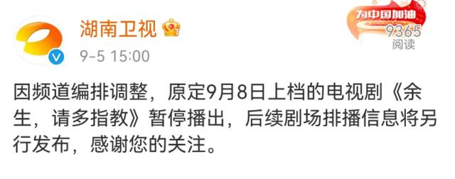 9月5日下午,湖南卫视发文确认了《余生,请多指教》的改档消息:“因频道编排调整,原定9月8日上档的电视剧《余生,请多指教》暂停播出,后续剧场排播信息将另行发布,感谢您的关注。 ”#余生请多指教改档#