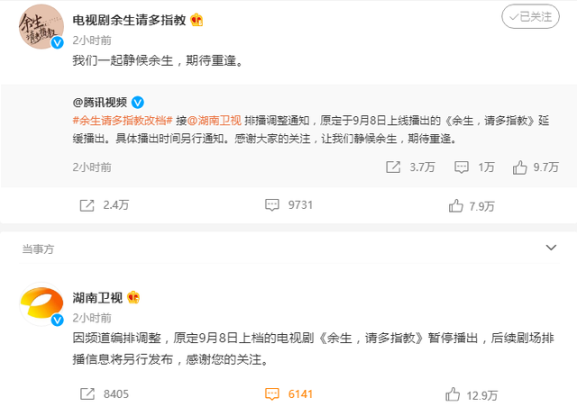 湖南卫视宣布撤档的消息发出后,网络播出平台及《余生》官微均发声表示理解,同时也号召大家一起“静候余生,期待重逢”。
