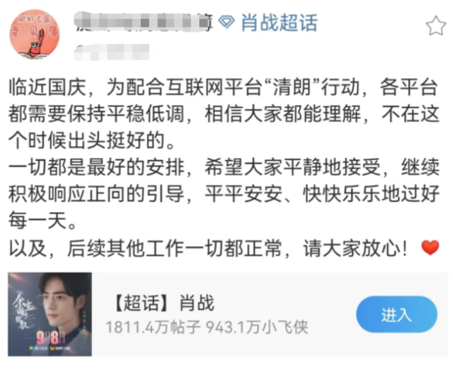 肖战的大粉表示现在要配合“清朗”行动,各平台都需要保持平稳低调,相信大家都能理解,不在这时候出头挺好的。这一切都是最好的安排,肖战作为“顶流”,虽然一直非常低调,可不能避免之前发生过重大事件。