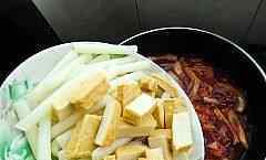 2 年糕切断,鱼饼切条,洋葱胡萝卜洗净切丝。
