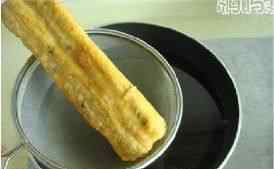 10 锅放油烧热,将蘸糊的千层茄子下锅炸至四面呈金黄色。