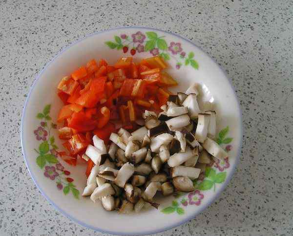9 下入红椒和香菇翻炒。加入食盐、五香粉和蚝油