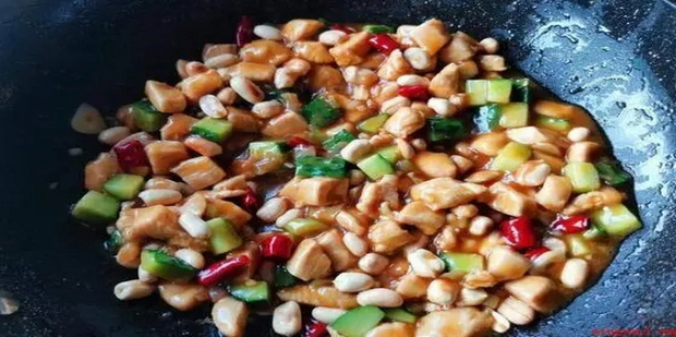 最后放入料汁,再放入黄瓜丁和熟花生米,翻炒均匀即可。