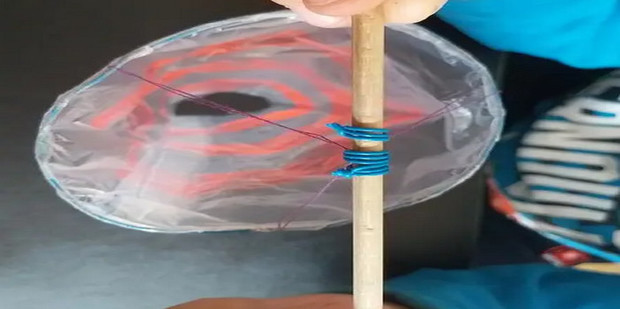 - 用铁丝在木棍上轻轻缠几圈,使它可以在木棍上自由转动,这是风向袋的支架