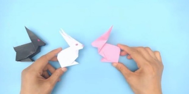 - 最后再将纸向里折,折出立体的兔角,折出兔子身后的地整方,展开将兔子身后周历的地方压下去,再把耳朵展开,做得更立体即可。