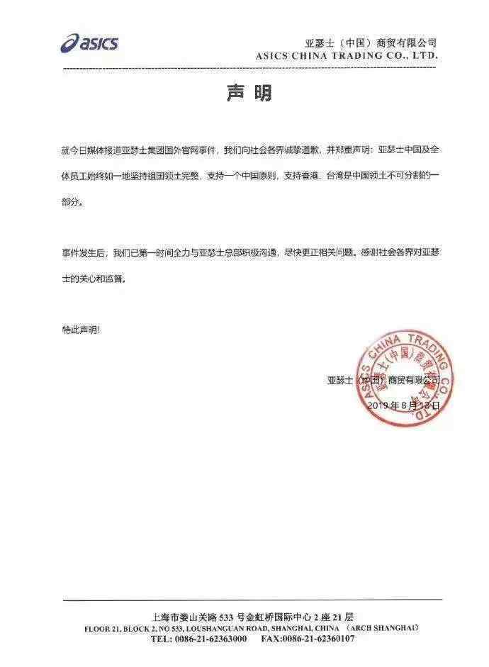 针对香港和台湾在国际版官网被列为国家,8月12日,日本体育品牌ASICS在官方微博上发表声明,就官网事件向社会各界道歉。