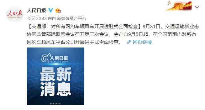 8月31日,交通运输新业态协同监管部际联席会议召开第二次会议,决定自9月5日起,在全国范围内对所有网约车顺风车平台公司开展进驻式全面检查。