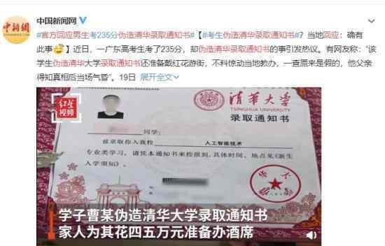 8月19日,据消息报道,网传广东省雷州市调风镇一考生伪造清华录取通知书,其父亲在村中花费几万元摆酒庆贺,得知真相后被气昏,随后紧急送往医院抢救,醒来时检查血压220。同一天下午,雷州市委宣传部表示,镇上一名候选人伪造通知是真的,事件细节正在了解和调查中。