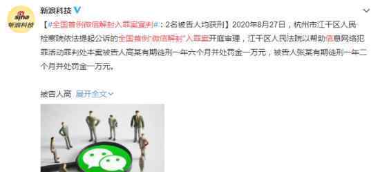 据江干区检察院微信消息,2020年8月27日,杭州市江干区人民检察院对首例“微信解封”案提起公诉,江干区人民法院以帮助信息网络犯罪活动罪判处被告人高有期徒刑一年零六个月,并处罚金人民币1万元,同时判处被告人张有期徒刑一年零两个月,并处罚金人民币1万元。