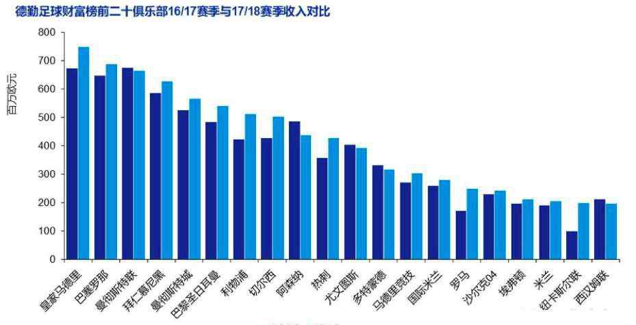 近日,德勤发布了一年一度的足球财富榜报告,收录了17/18赛季世界上收入最高的20家足球俱乐部及其排名。