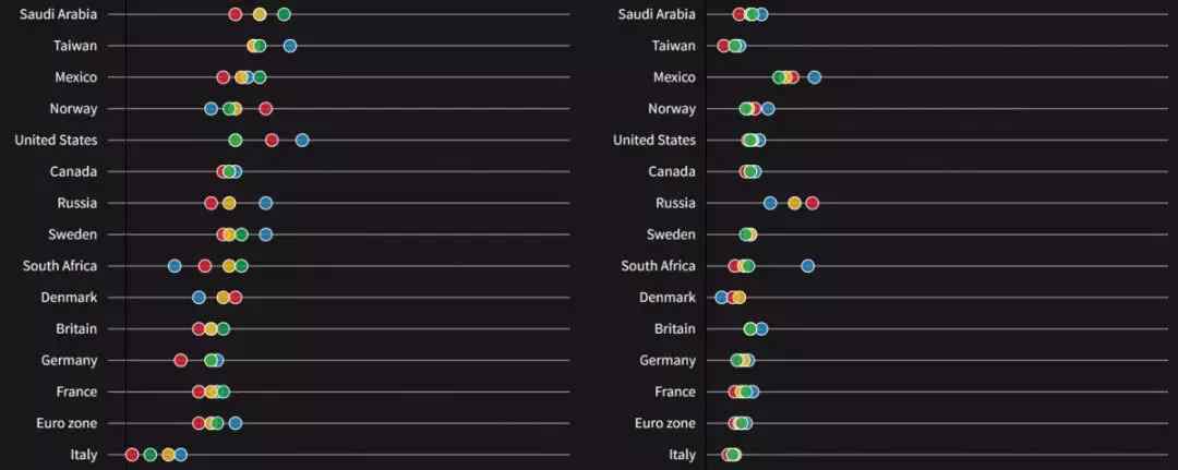 下图是路透社调查对主要发达市场和新兴市场国家未来三年(2018年实际蓝点、2019年红点、2020年黄点、2021年绿点)GDP和通胀的预测: