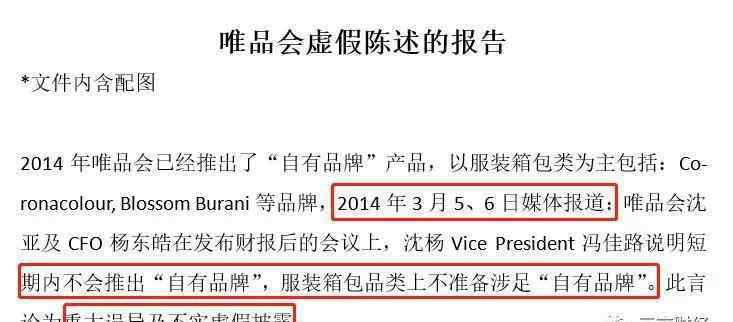 根据举报者向三燕金融提供的一份“关于唯品会虚假陈述的报告”,2014年3月,唯品会在财务报告发布后的会议上表示,短期内不会推出自己的品牌,也不准备涉足服装和包类。
