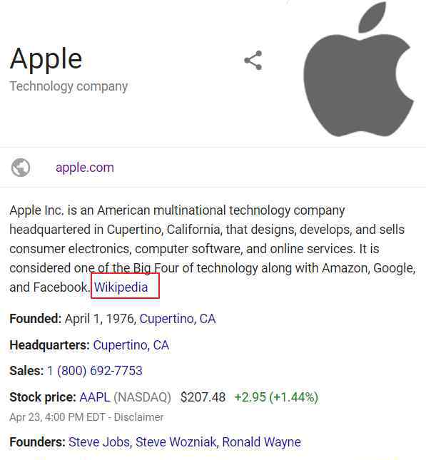 能提升品牌曝光度和权威度:你的潜在用户能在维基百科上找到你的品牌/词条页面,瞬间就会觉得你们的品牌够权威,另外,由于 维基百科网站的权重够高,Google SERP 中出现品牌/产品的维基百科词条页面同时也能提升品牌的曝光度能提升网站SEO 权重:如上所述,身为一个全球如此知名,权重如此之高的网站,如果品牌/产品页面能够获得来自维基百科的链接(即使是Nofollow),其外链价值也是不言而喻的能提升推介流量:有链接,则极有可能带来点击。作为知识类的分享站点,用户很愿意也很放心点击维基百科上的链接。能丰富搜索结果多样性:我们在搜索某些知名品牌(如下图搜索Apple的结果展示)时,经常会看到搜索结果右边有谷歌知识面板(Google Knowledge Graph)的内容展示,而维基百科词条的内容恰恰就是这个谷歌知识面板内容的主要来源之一。