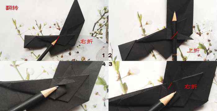 13.沿着上面图1中的红线向上向右折叠三角形,形成上面图3中的图案。这里需要注意的是,图2所示的图案形成后,反面不要移动,正面可以做。