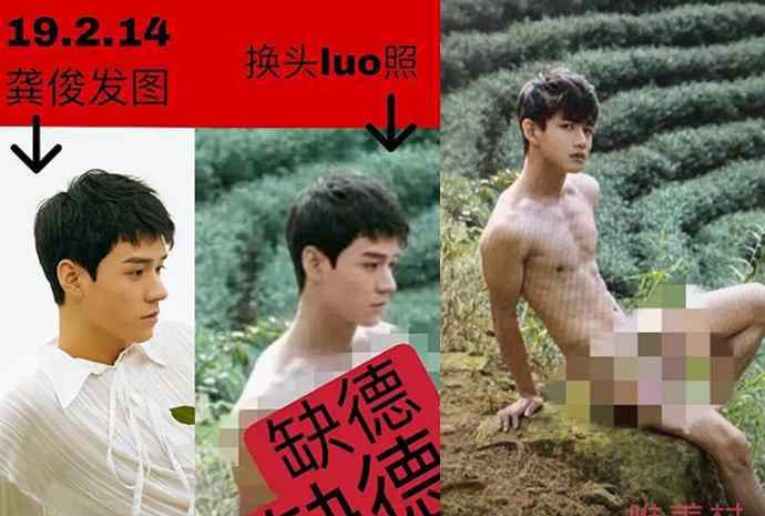 黑粉P图中的龚俊,是裸体坐在茶园的一个土坡上,尺度这大令人咋舌。龚俊的粉丝很快就发,这张黑图上面龚俊的脸,其实是P上去的。原图是龚俊在2019年2月14日的时候,在自己的微博上发的一张帅气写真。龚俊的粉丝可是很强大,很快也拔出了那张裸体的原图,原图根本就是一个不知名的男模特。黑粉移花接木把龚俊的头,给劈到了这张男模特的裸照上面。