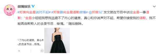 1月13日,郑爽在社交媒体上发文向金晨道歉。郑爽在文中称,“金晨小姐姐我想我逃避不了内心的谴责,真心和你说声对不起,希望你接受我的道歉,我不能再自欺欺人的去录节目…惭愧。” 此前,郑爽在追光吧哥哥节目中提及金晨理想型相关。现郑爽已将该道歉微博删除。