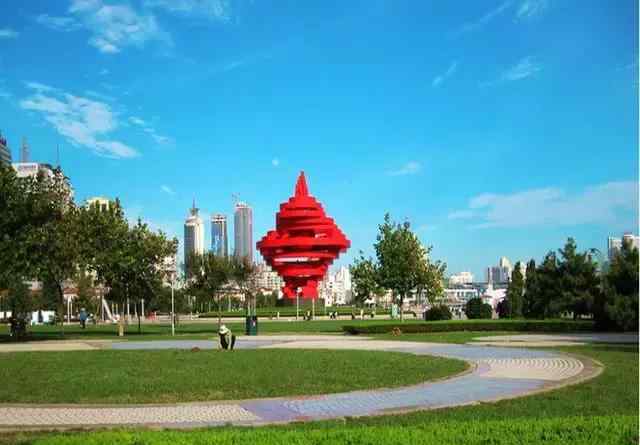 五四广场上矗立着燃烧的雕塑“五月之风”,象征着青岛的城市精神。它在夜晚的灯光下看起来非常漂亮。