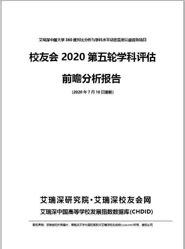 2020年9月,爱瑞申校友会网(Cuaa。Net),国家第三方高校评估研究机构依托国内首个免费的“爱瑞申中国大学360度比较分析与学科水平动态监测公益咨询项目”,正式发布《校友会2020年第五轮学科评估前瞻分析报告》。它有助于中国高校第五轮学科评估的预评估和自我评估,为社会各界了解2016-2019年中国高校的发展实力和学科竞争力提供权威