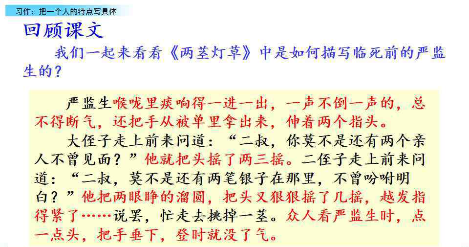 (2)通过人物的动作、语言、举止、心理等具体写出人物的特征。