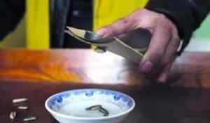 面对人们的质疑,大军说,秘密就在创可贴的左手食指上,因为里面藏着一块磁铁。军队又给大家示威了。将2粒种子放入小碗后,盖上盖子,再打开,里面又变成3粒种子;军队又合上盖子,又打开,变回两粒。当军队把盖子盖起来的时候,大家恍然大悟。原来盖子上有一粒铁瓜子,只要军队食指一松,就会掉进碗里。“只要手法练得熟练自然,一般人根本看不出来。”军队说。饭桌上人多的时候,也就是摆摊骗人的时候,军队说一般在省人民医院和省肿瘤医院之间的魏武路附近摆摊。之所以选择这个地方,是因为这里外国人多,有钱看病的人多,急需集资的人多。这些人是他们的潜在目标。