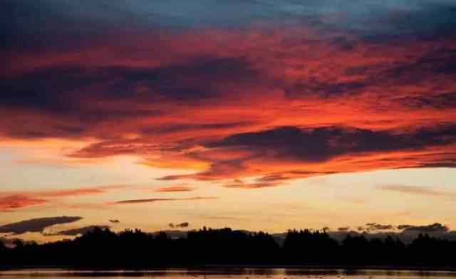 在这张日落照片中,天空中有彩色的红色云彩,地面上有树木的黑色轮廓。黑森林平衡了天空中大面积的云,保证了照片不会失衡。