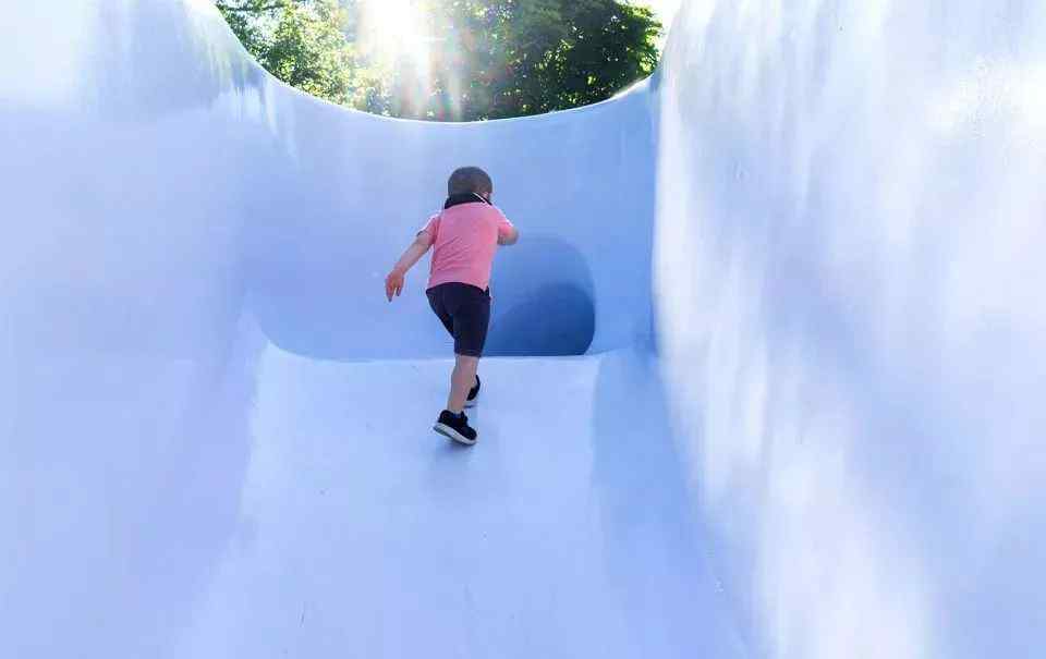 设计者在中间的内凹处放了一个蹦床和绳子结构,儿童可以在装置内攀爬;装置的一侧有一面镜子,可以反射周围的环境,镜子里路人的身影扭曲变形,很有意思;另一侧有凹球门,儿童活动区可延伸至装置外的场地;它的一端故意挖掘空,这是一个自然的悬挂秋千的结构。设备上大大小小的“洞”成为孩子们自由探索的秘密空。