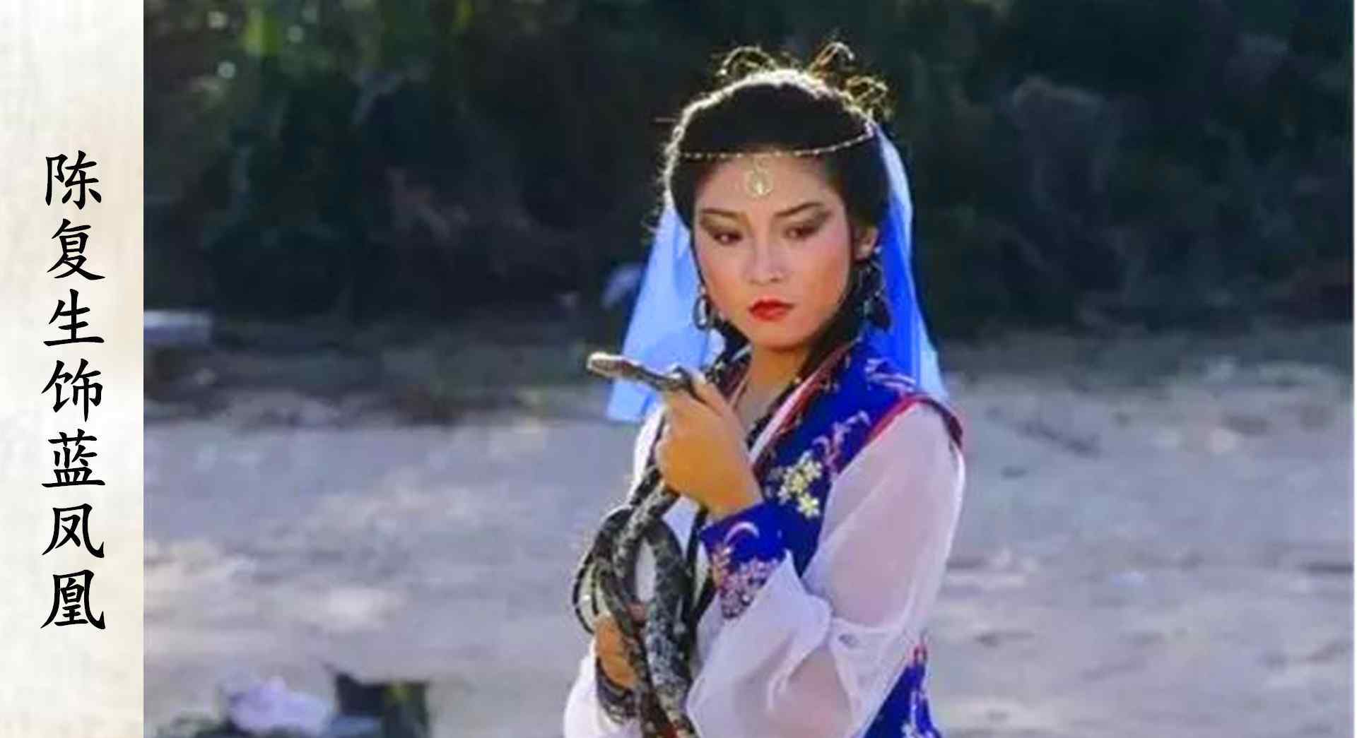 1984年,笑傲江湖周润发版由陈复生饰演蓝凤凰,也是蓝凤凰最早的版本。外形上更像苗族女巫,但缺少一点美和魅力。剧照里,头饰和中国人没什么区别,大耳环也没了,所以长相不是很合格,但是拿蛇的场景还是挺震撼的。不知道是道具还是真蛇...