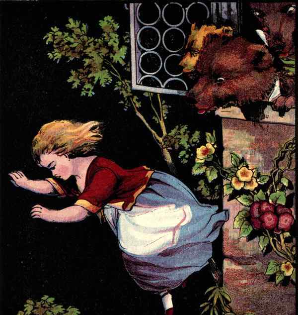 ▲熊想咬小女孩。小女孩睁开眼睛,看到三只熊,冲到窗前。窗户是开着的。她从窗户跳出去逃走了。三只熊终究没能追上她。