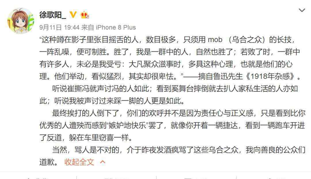 后来徐歌阳做了两件事:第一,她把一些人声讨她的动机定义为嫉妒和幸福;第二,她把自己定义为一个受害者,这个受害者非常痛苦,甚至连道歉的权利都被经纪公司剥夺了。