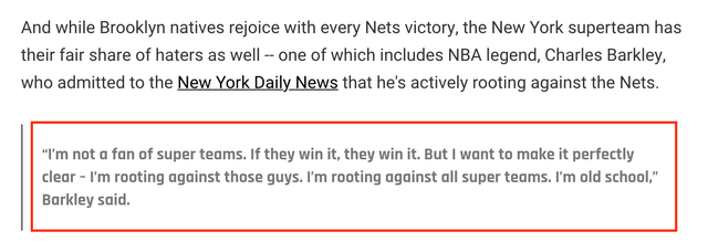 在篮网成为本赛季最有机会冲击总冠军奖杯球队的情况下,这支拥有杜兰特,欧文和哈登的三巨头球队仍要面临不少质疑,例如名宿查尔斯-巴克利就明确表示对这支篮网的反感: