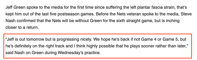 “杰夫-格林明天无法出战,但他进展顺利。我们希望他能在第4场或是第5场比赛中复出,但他绝对身处正确的轨道上,我认为他很可能早日上场”纳什说道。