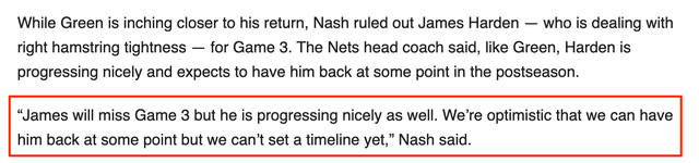 同时,纳什也透露了球队当家巨星詹姆斯-哈登的伤病情况,纳什表示,目前哈登仍在处理右腿筋拉伤的伤病问题并且不会出战篮网对阵雄鹿系列赛的第3场比赛,不过纳什也表示,哈登和格林一样伤病康复进展顺利,并且希望他能在未来某个时候重返赛场: