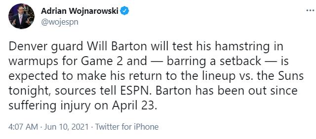 希望经过一天的休整后,约基奇能够重新打出MVP级别的水准。对于掘金来说好消息是,据名记Woj报道,巴顿将会在G2赛前热身时测试自己腿筋恢复情况,若一切顺利,他将会出战今天对阵太阳的G2。
