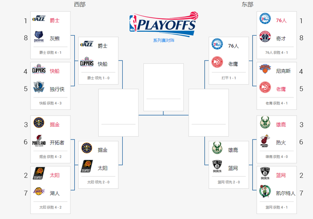 东西部次轮的情况如下:费城1-1老鹰,篮网2-0雄鹿,太阳2-0掘金,爵士1-0快船,爵士逆转快船后也改变了联盟的风向,费城虽然丢了一个主场但G1他们险些逆转27分,G2也一直压制老鹰,他们的晋级概率依旧比老鹰出色。