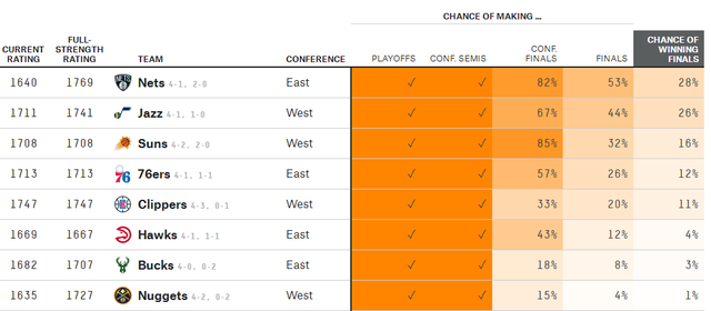 雄鹿就十分危险了,篮网在让了一个詹姆斯-哈登的情况下连续两场都狂胜,雄鹿季后赛第一的防守效率根本毫无作用,篮网的小阵容都可以锁死雄鹿的大阵容,篮网的夺冠概率只有28%联盟第一了。
