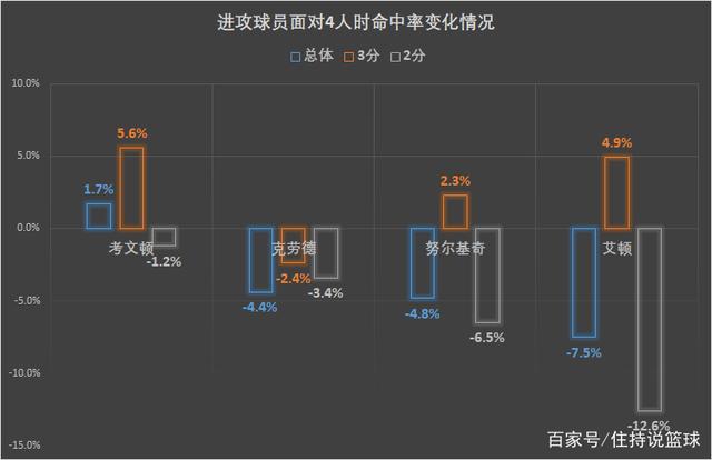 上图是进攻球员在面对4人时命中率的变化情况,可以很好地反馈球员的防守水平,我们可以看到,进攻球员面对考文顿时,命中率会比平时高1.7%,三分命中率更是高了5.6%,说明考文顿外线防守较差;而面对克劳德时,命中率会比平时低4.4%,三分命中率也要低2.4%,总体来看克劳德不管是3分还是2分防守都比较优秀。