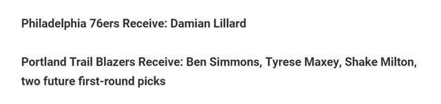 潜在交易方案:费城送出本西蒙斯+马克西+米尔顿+两枚未来首轮签,从开拓者队得到利拉德。