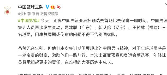 官方写道:“距离中国男篮亚洲杯预选赛首场比赛仅剩一周时间,中国男篮集训人员再次发生变动。易建联(广东)、郭艾伦(辽宁)、王哲林(福建)三名球员,因康复周期或伤病的问题不得不告别国家队。”