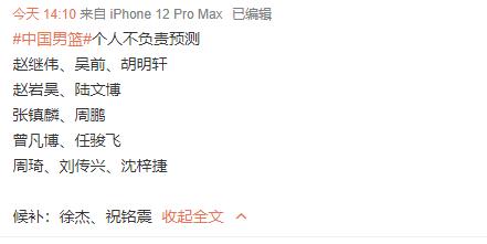 这种情况下,李天宇爆出了最终的大名单。他表示:你们看@王兆丰_Mirko 列的名单就行了,都对的。而王兆丰在今天下午2点的时候就已经预测了的大名单,这其中的后卫分别是赵继伟、吴前、胡明轩,这样的阵容其实并不差。当然徐杰并没有在名单内,他是一个候补的球员,可能还是因为他的身高不行吧。但可以出现在候补,已经非常不错了。