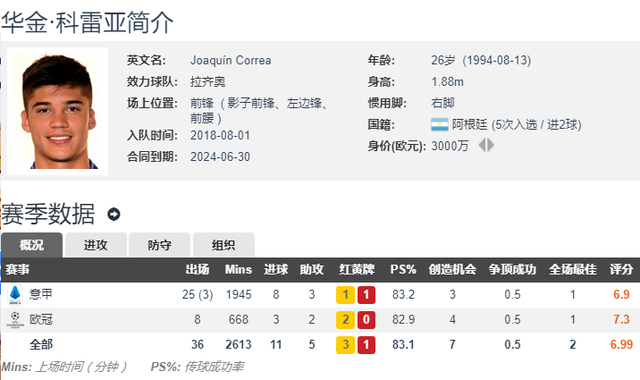 现年26岁的阿根廷前锋华金-科雷亚,本赛季一共为拉齐奥出战了28场意甲的比赛,打入了8个进球,有3次助攻,并出战了8场欧冠的比赛,打入了3个进球,有2次助攻。科雷亚与拉齐奥的合同在2024年到期,目前球员的德转身价为3000万欧元。