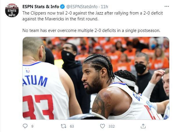 根据ESPN的统计,NBA历史上没有任何一支球队能在两次0-2落后的情况下逆转,快船如果能做到就是历史第一支球队,但各项数据都说明他们将要很快出局了,形势对于联盟战绩第一的爵士来说是一片大好。