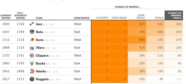 根据美媒FiveThirtyEight的分析爵士队击败快船晋级西决的概率已经高达82%,快船只剩下18%的概率逆风翻盘,他们在首轮翻盘独行侠与东契奇的颈部伤势有关,而爵士目前除了康利外没有核心有伤,除非上天再一次眷顾他们但爵士队球员必然会很小心。
