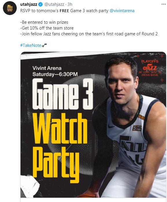 爵士队官推已经在渲染G3了,让爵士队的球迷在线上一同观看G3,届时球队会送上一些小礼品,可见爵士队十分自信,他们拿下G3的信心很足。