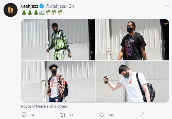 爵士与快船的G3将只6月13日打响,在6月12日爵士众将已经从盐湖城飞往了洛杉矶,他们将在斯台普斯继续与快船鏖战,从爵士官推发布的图集来看众将十分轻松,爵士2-0领先快船全队士气高昂。而快船的官推却没有任何的音讯。