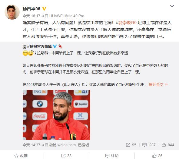 大连人后卫杨善平则转发了关于卡拉斯科的新闻并且也做出点评:“确实脑子有病,人品有问题!就是惯出来的毛病!”