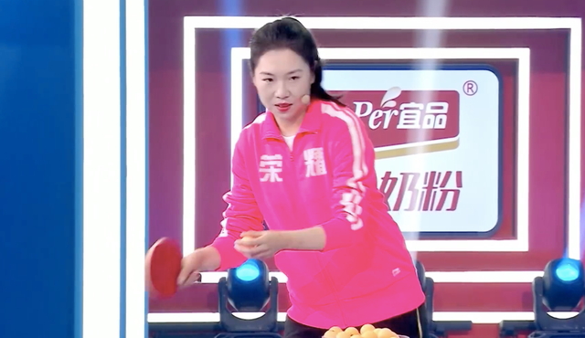 参加综艺节目的李晓霞身穿粉色运动外套,胸前写着“荣耀”二字,她扎着高马尾,化着妆,尤其是大红唇很是抢镜。李晓霞玩起了她最熟悉的乒乓球,她站在乒乓球台一端,另一端拍着一排竖起的乒乓球拍,球拍从大到小依次排列,李晓霞要用发出的乒乓球将球拍击倒。