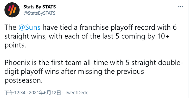 根据美媒《Stats By STATS》赛后统计,太阳队已经在季后赛取得6连胜,并且在过去5场比赛中,都至少赢下对手两位数。